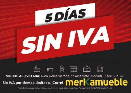 Salones, dormitorios, muebles juveniles, sofás, colchones, muebles auxiliares… aprovecha esta oportunidad y amuebla tu hogar con todo, menos con el IVA. No dejes pasar una ocasión única.