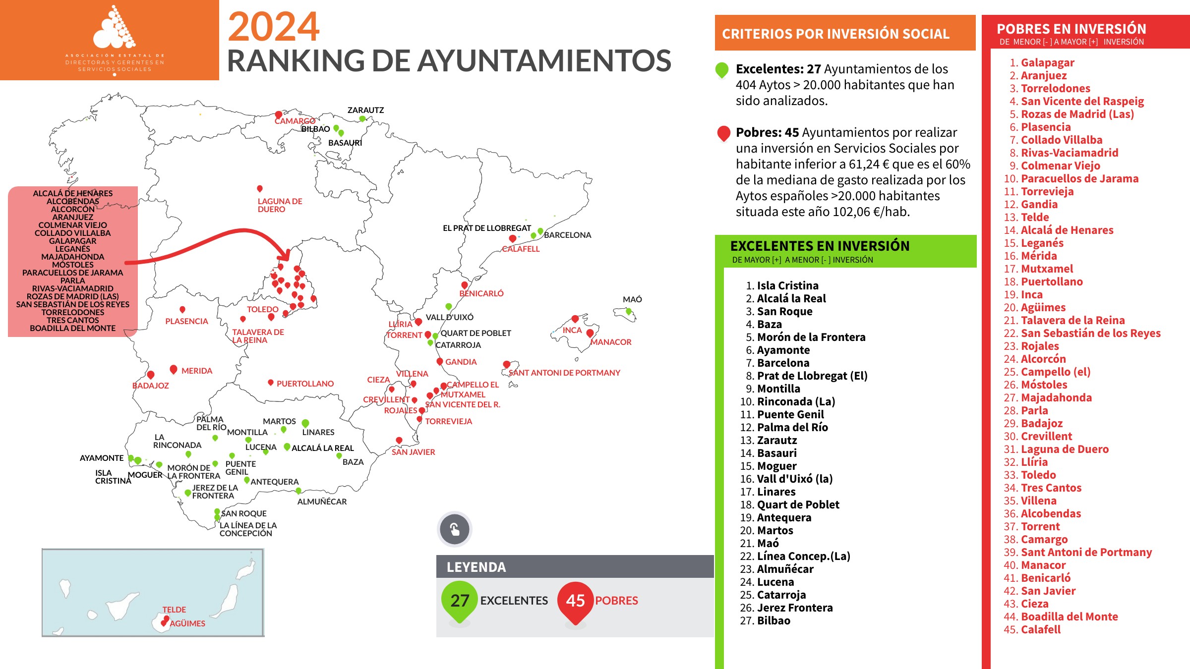 Estas localidades del Noroeste forman parte del grupo de 45 localidades españolas que atendieron a sus vecinos en 2024 con una inversión por debajo de la media nacional para ayuntamientos de más de 20.000 habitantes, que se situó 106,48 euros por habitante año. Todos repiten en el informe, “en un ejemplo de persistencia de sus Corporaciones municipales en mantener a sus vecinos con unos Servicios Sociales infradotados económicamente, y, en consecuencia, carentes de los derechos sociales que legítimamente les corresponden”, señalan desde la Asociación Estatal de Directoras y Gerentes de Servicios Sociales.