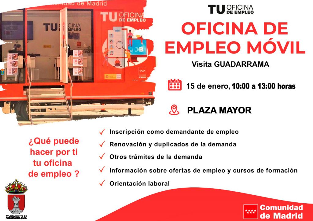 Los interesados en conocer los servicios de la Oficina de Empleo de la Comunidad de Madrid, consultar dudas o resolver problemas, pueden acercarse directamente sin cita previa a la unidad móvil, en el horario establecido, para ser atendidos por los técnicos de empleo.