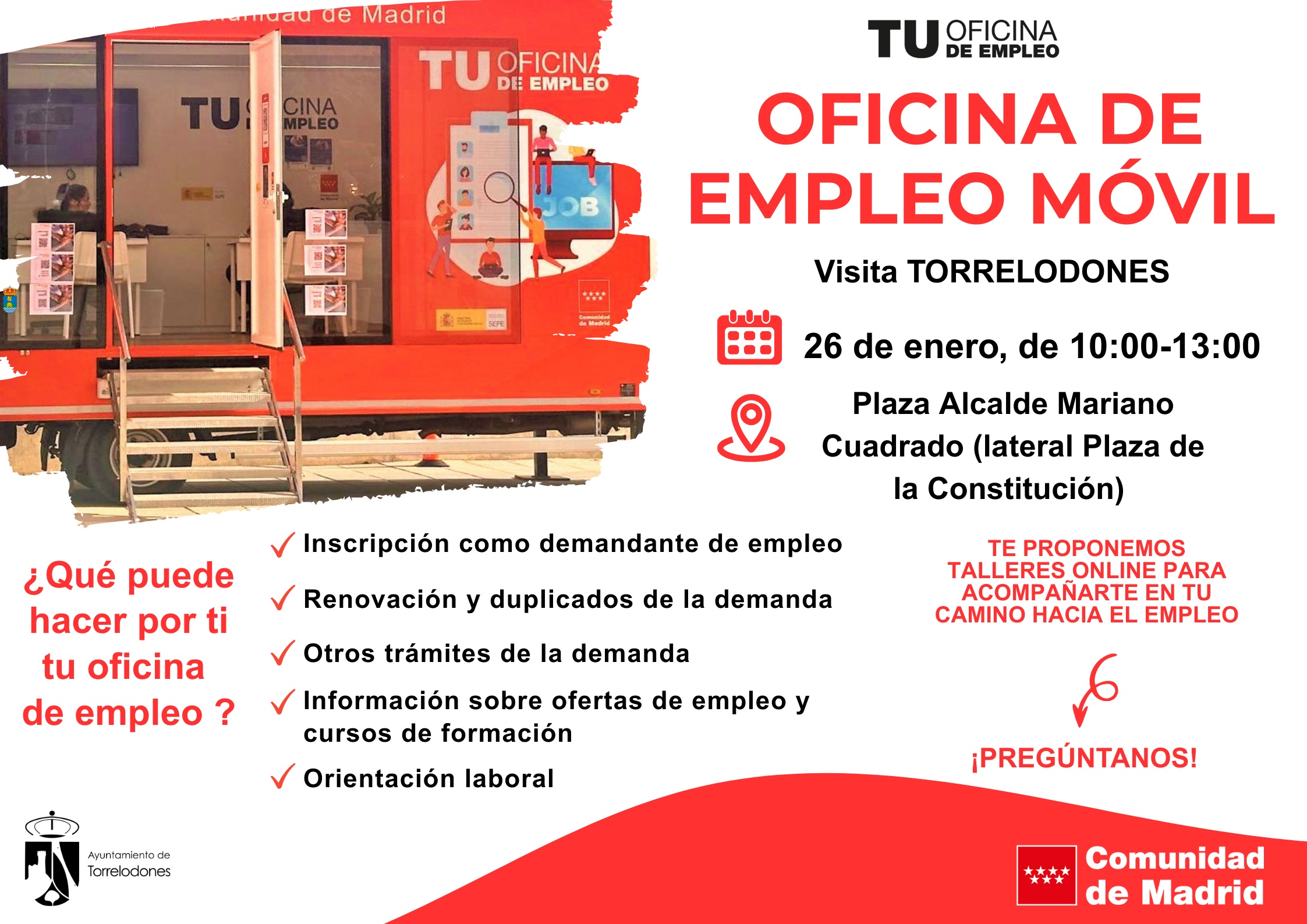 Asimismo, para acceder a los servicios de empleo de la Comunidad de Madrid, el trabajador tiene que estar inscrito como demandante de empleo en el servicio público de empleo. La visita de la Oficina móvil de la Comunidad de Madrid está coordinada por la Concejalía de Empleo del Ayuntamiento de Torrelodones.