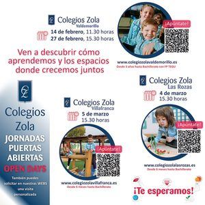 Para dar a conocer su proyecto educativo e instalaciones a las familias, han organizado unas jornadas de puertas abiertas. Los días 14 y 27 de febrero se podrá visitar el Colegio Zola Valdemorillo. El 4 de marzo se ofrece la oportunidad de visitar el Colegio Zola Las Rozas, y el 5 de marzo, el Colegio Zola Villafranca. También puedes solicitar visitas personalizadas. En ambos casos, la forma de inscribirse es a través de las webs de cada uno de los centros, puedes encontrarlas en www.zolaeducacion.es.