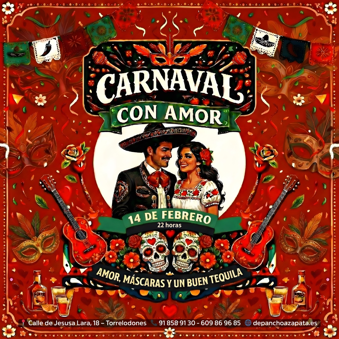 Este año San Valentín cae en sábado… y además es sábado de Carnaval. Por eso en De Pancho a Zapata está preparando una celebración por todo lo alto, ‘Carnaval con Amor’, la fusión perfecta entre la pasión del 14 de febrero y la locura del Carnaval.
