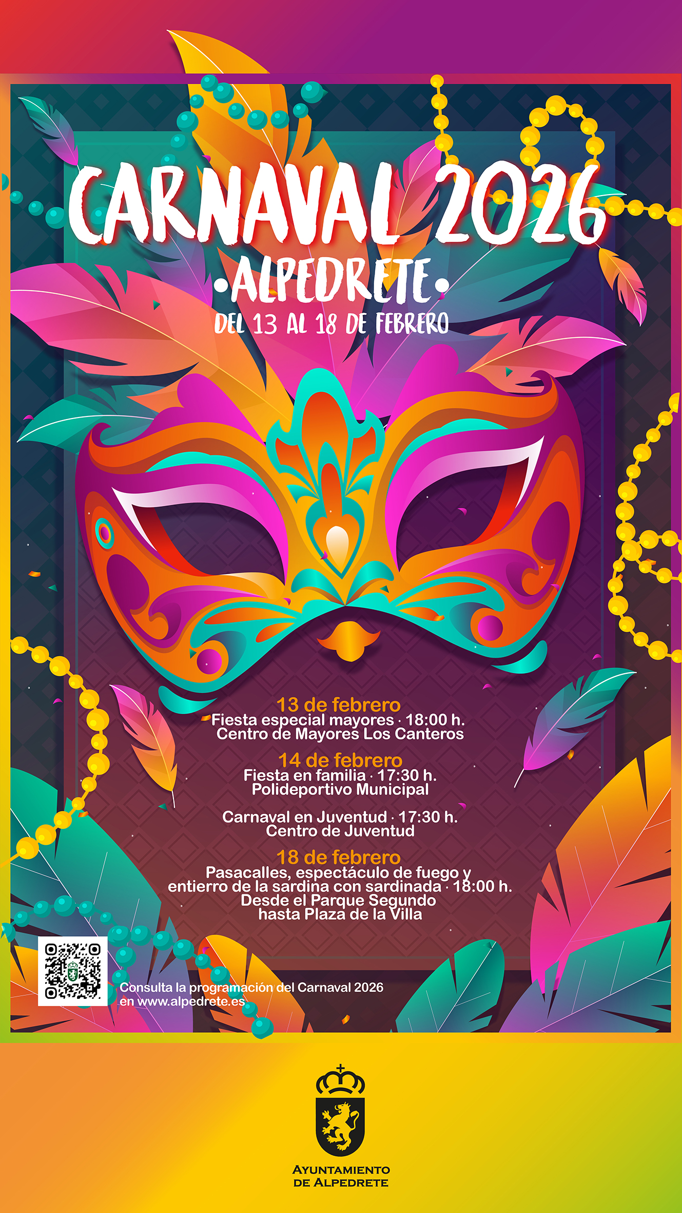 Alpedrete celebrará el Carnaval 2026 del 13 al 18 de febrero con una completa programación pensada para todos los públicos. Durante esos días, vecinos y visitantes podrán disfrutar de diferentes propuestas que van desde fiestas temáticas hasta actividades familiares y juveniles, culminando con el tradicional Entierro de la Sardina en la Plaza de la Villa.