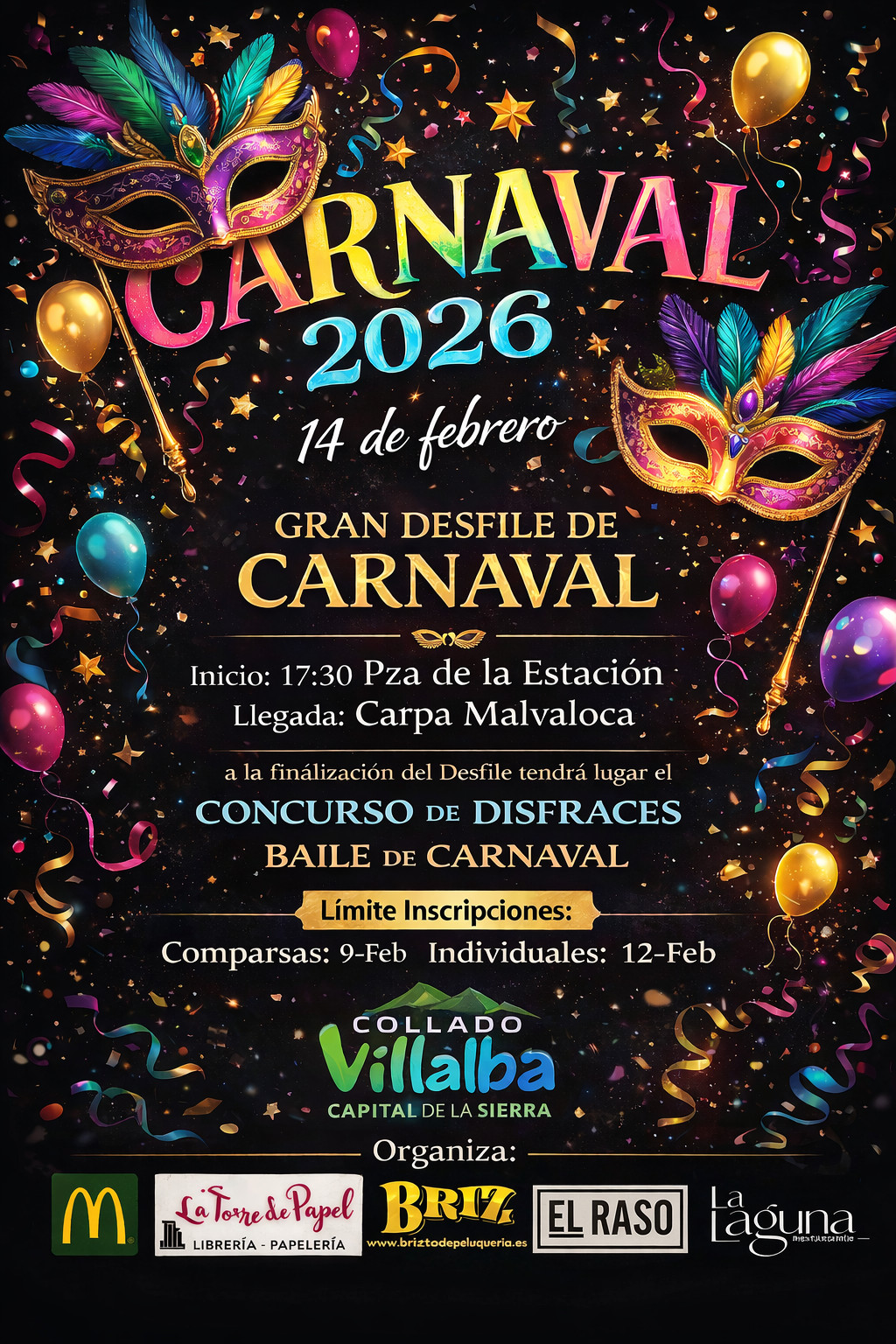 Este sábado, 14 de febrero, se celebra el gran Desfile y Concurso de Disfraces de Carnaval de Collado Villalba, seguidos del tradicional Baile de Carnaval, en la Carpa de La Malvaloca.