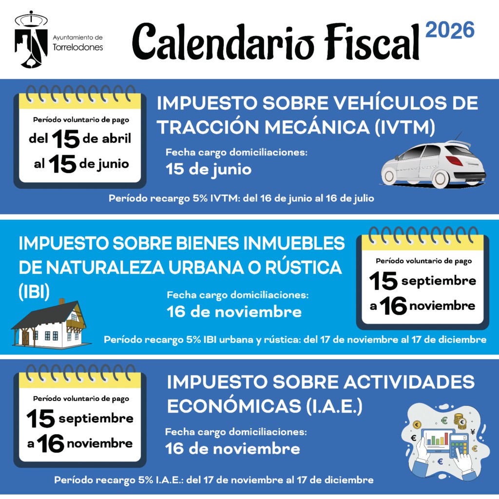 El Ayuntamiento de Torrelodones ha publicado su Calendario Fiscal para 2026, que incluye las fechas de cobro de los tributos municipales. El periodo establecido para el pago del Impuesto sobre Vehículos de Tracción Mecánica (IVTM) será desde el 15 de abril hasta el 15 de junio. Para aquellos contribuyentes que tengan domiciliados los recibos, la fecha de cargo se fijará en el 15 de junio.